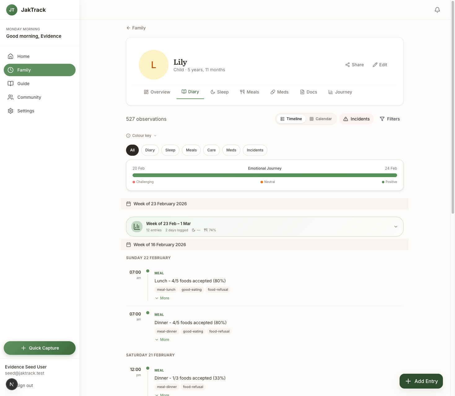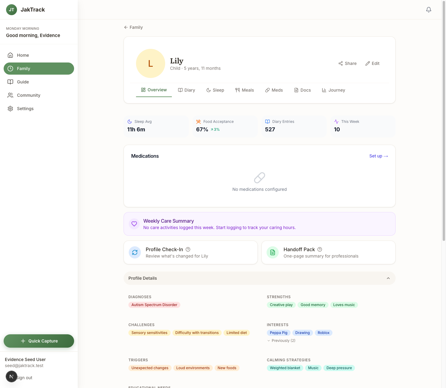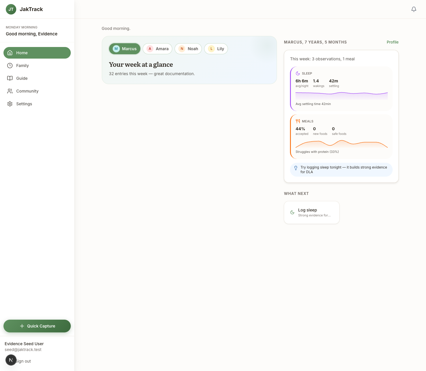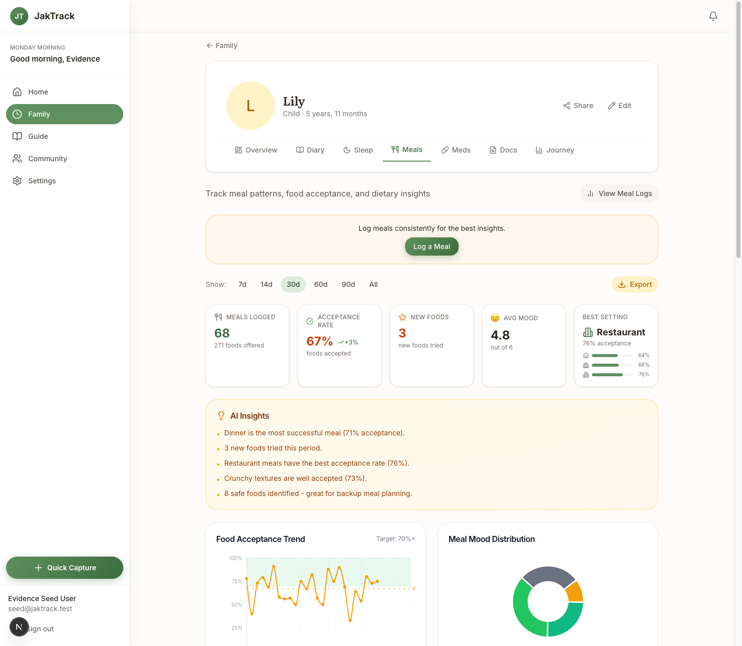 JakTrack tracks patterns over time. Sleep trends, meal acceptance rates, sensory triggers, mood patterns - all derived from your daily logging. When something shifts, the app notices and tells you. That's evidence you can take to a professional, not just a gut feeling that gets nodded at and ignored.