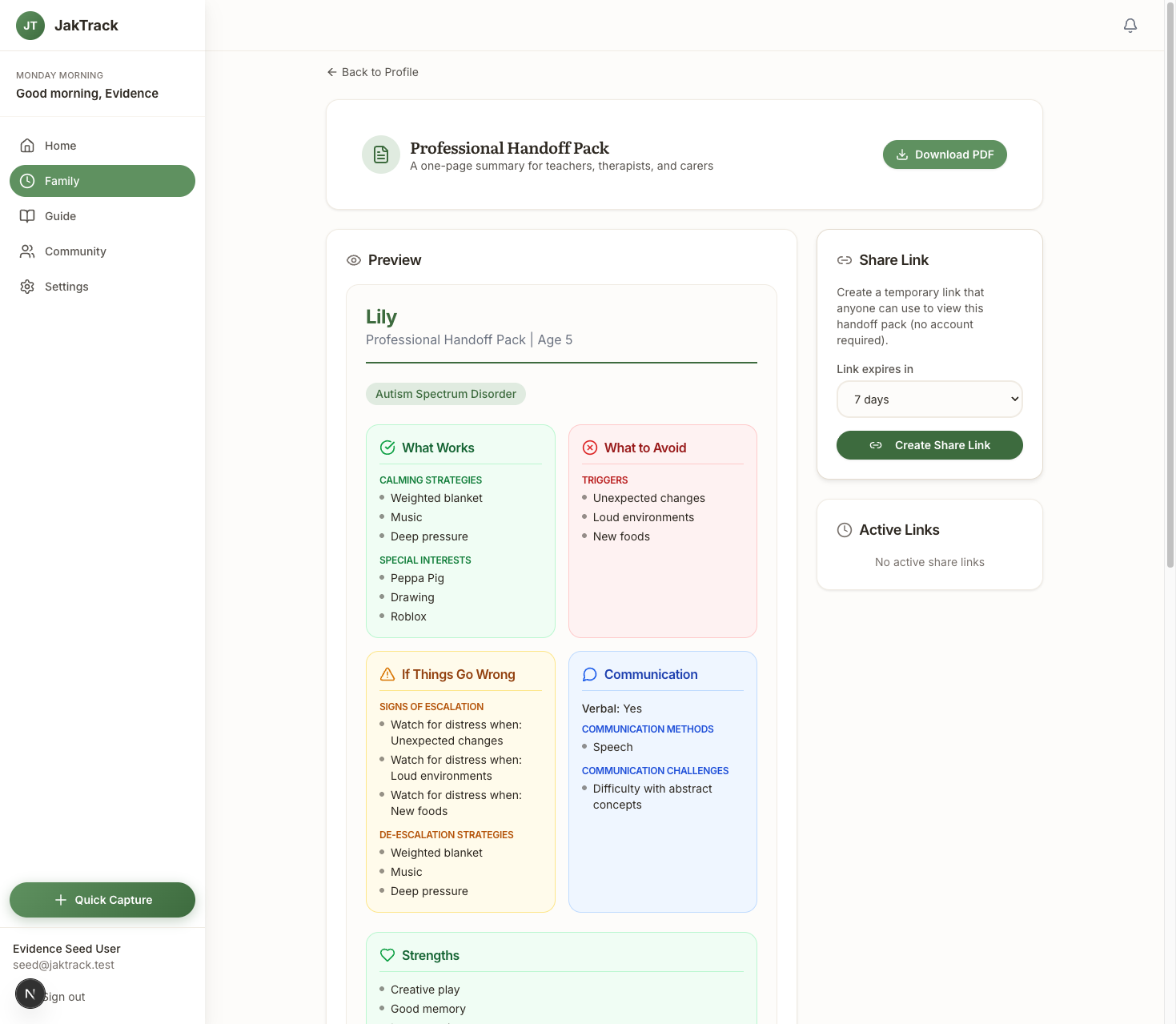 The professional handoff pack generates a one-page summary of your child's needs, strategies, and recent patterns. Hand it to a new teacher and they know what they're dealing with on day one. Bring it to the annual review and you're the most prepared person in the room.