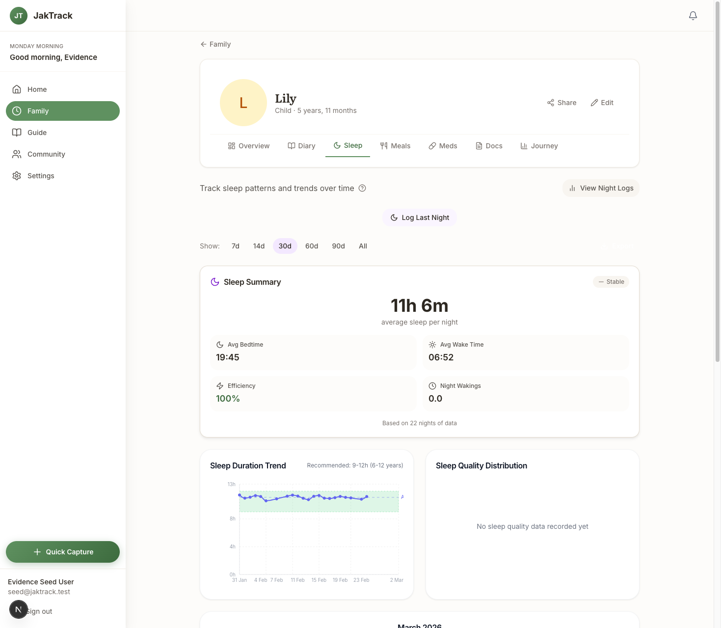 JakTrack's sleep tracker logs night wakings, interventions, settling time, and care duration - exactly what DLA assessors are looking for. It calculates total night care time automatically. After a few weeks of logging, you've got a body of evidence that would take hours to piece together from memory.